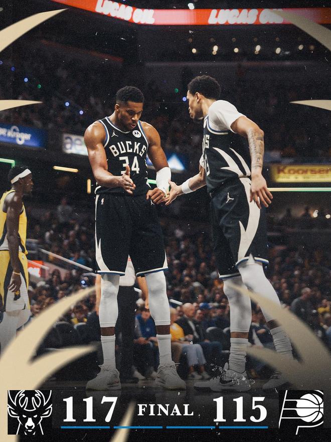 内史密斯轰进三分球,字母哥冲击篮下被封盖,罗林斯失误,特纳大帽谢泼德的远投。罗林斯外线不中,西亚卡姆2罚1中,比赛进入白热化阶段。字母哥外线不中,格林抢下前场篮板被犯规,格林2罚1中。内史密斯上篮,步行者追平比分。距离终场仅剩14.5秒,道格里弗斯请求暂停。字母哥面对双人防守持球进攻,随后背身单打压哨绝杀对手。最终,雄鹿以117比115险胜对手,拒绝了12分逆转。