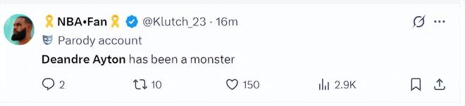 湖媒:艾顿这场比赛表现的像头野兽。(今夏艾顿与湖人签下两年1600万,今年只有800万的艾顿这个表现真的可以了)