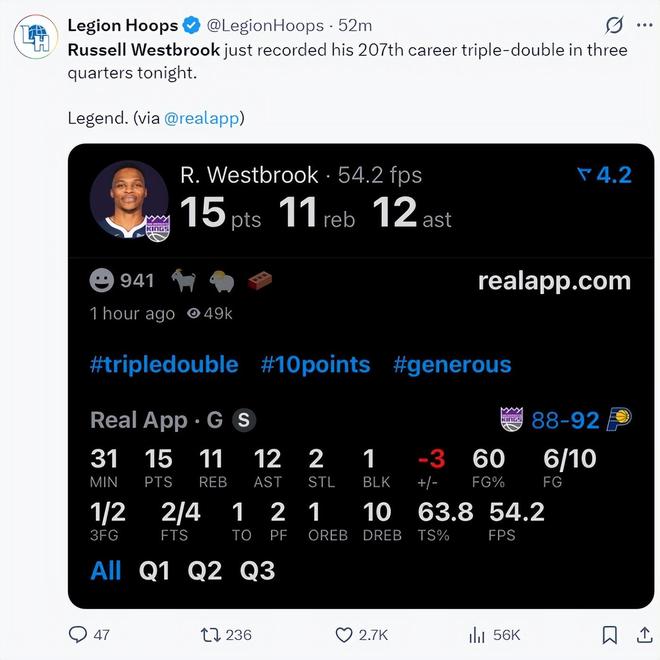 国王队官方也晒出推文祝贺拉塞尔-威斯布鲁克完成自己新的生涯里程碑。