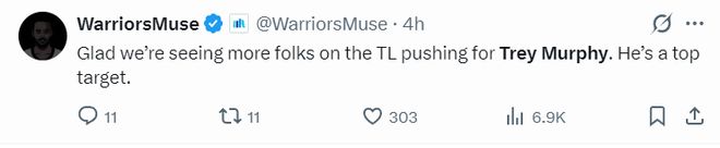 勇士媒体赛后写道:看到越来越多的勇士球迷期待特雷-墨菲的加盟我倍感欣慰。