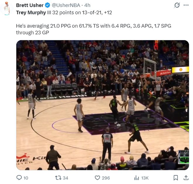 鹈鹕VS马刺的比赛中,墨菲全场比赛38分钟,21中13,三分6中2,拿到32分3篮板4助攻2抢断1盖帽,这场比赛后墨菲本赛季已经场均21分6.4篮板3.6助攻1.7抢断,真实命中率高达61.7%。