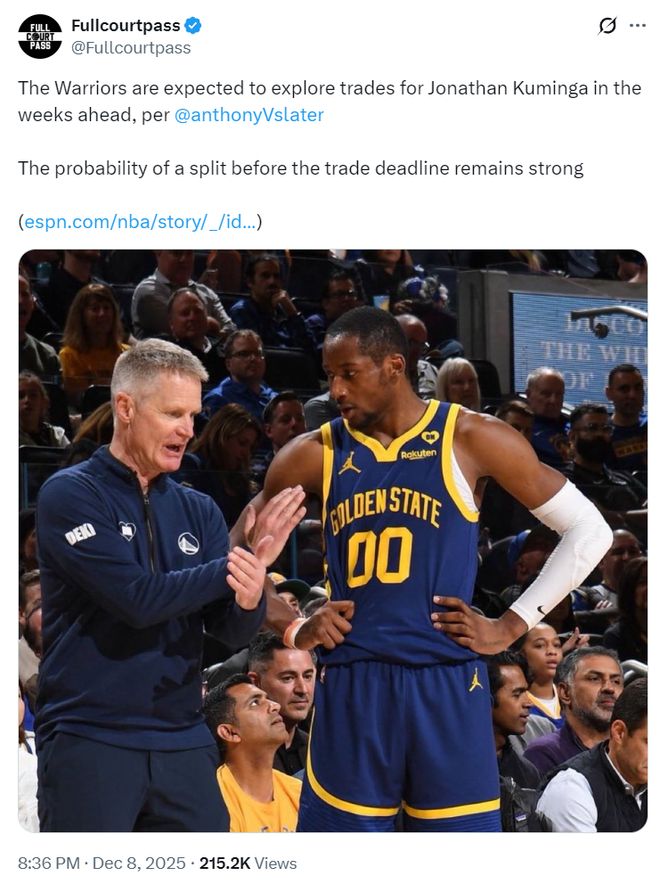 一天之前,根据勇士队记安东尼-斯莱德的报道,勇士队会在未来几周内探索库明加的交易价值,双方的分手概率极大。